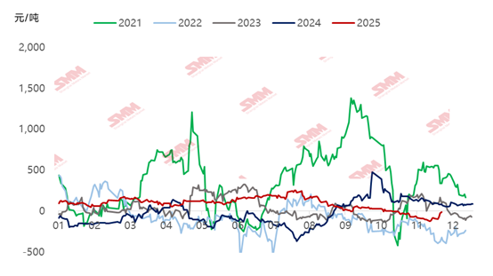 数据来源:SMM钢铁 东北地区,钢厂利润在(-100-0)之间,区域内钢厂生产效益变化不大,个别钢厂钢坯接单较好,直接减量成材出钢坯。 华北地区,钢厂利润在(-300-100)之间,部分钢厂前期检修已复产,建材产量有小幅回升;而山西区域多家钢厂维持前期检修停产或保品种材生产,建材产量继续处于低位水平。 华东地区,钢厂利润在(-100-200)之间,区域内厂家生产效益明显好于其他区域,且个别钢厂轧线检修复产,而其他钢厂生产变化不大,产量增幅不大。 西北地区,钢厂利润在(-300-0)之间,个别钢厂生产亏损严重,计划月初检修线盘轧线,12月线盘计划产量降幅明显;此外其他钢厂因利润亏损影响,继续减量建材。 华中、华南地区,钢厂利润在(-100-0)之间,区域内有多家钢厂检修高炉,且相应减少轧线产量,尤其是湖北区域主流钢厂优先减产建材,转产品种材,其中螺纹产量月环比降幅或在38.17%,12月计划产量降幅远大于其他区域。 西南地区,钢厂利润在(-100-0)之间,区域内钢厂效益基本与前期相差不大,现金流压力尚可的情况下,暂维持正常生产。 图3:2021年至今钢厂生产螺纹钢即时利润走势