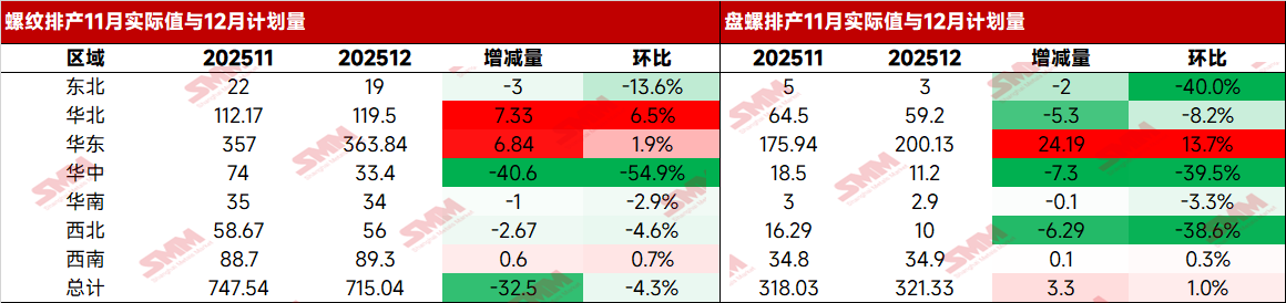 数据来源:SMM钢铁 整体来看 11月全国建筑钢材价格走势震荡上行,中上旬市场交易回归基本面,现货价格处于底部震荡阶段;中下旬消息面带动市场情绪好转,叠加需求阶段性好转,价格逐步上涨。成本方面,铁矿短期价格支撑力度较强,而焦炭首轮提降落地,成材价格走势强于原料端,钢厂生产成本有下降,现阶段钢厂盈利率在48.7%,月环比有明显改善,普遍效益水平在(-200-200)之间。12月各钢厂年检后继续保品种材产量,建材总产量进一步下降。具体来看,中南区域产量降幅最大,主要是湖北多家钢厂12月集中性年检,且铁水优先保板材,个别钢厂则将建材轧线全停,产量影响较大;而东北区域进入冬休阶段,建材需求表现偏差,部分钢厂直接外卖钢坯,成材减量明显。 分地区来看 表1:螺纹、盘螺排产11月实际值与12月计划量