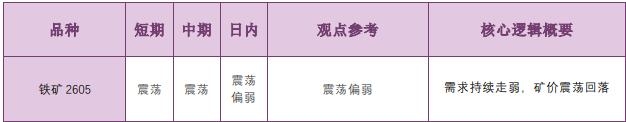 说明: 1.有夜盘的品种以夜盘收盘价为起始价格,无夜盘的品种以昨日收盘价为起始价格,当日日盘收盘价为终点价格,计算涨跌幅度。 2.跌幅大于 1%为弱势,跌幅 0~1%为震荡偏弱,涨幅 0~1%为震荡偏强,涨幅大于 1%为强势。 3.震荡偏强/偏弱只针对日内观点,短期和中期不做区分。 ◼ 行情驱动逻辑 铁矿石供需格局走弱,年末钢厂检修增多,矿石终端消耗持续下行,且盈利状况未好转,矿石需求延续弱势局面,继续拖累矿价。与此同时,国内港口到货虽有所回落,但海外矿商发运环比增加,且两者仍处年内高位,海外矿石供应表现积极,而内矿供应相对平稳,铁矿石供应维持高位。总之,铁矿石需求持续走弱,而供应维持高位,矿市基本面表现偏弱,高估值矿价易承压,相对利好则是市场情绪偏暖,多空因素博弈下矿价将偏弱震荡运行,关注钢材表现情况。(仅供参考,不构成任何投资建议) 责任编辑:七禾小编 |