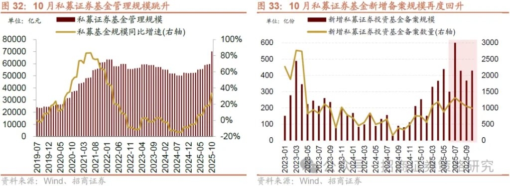 (3)私募基金 基金业协会最新数据显示,截至2025年10月,私募基金管理规模7.01万亿元,管理只数8万只,分别较2025年9月增加10000亿元和369只,10月私募基金管理规模跳升。此外10月新增私募证券投资基金备案规模429亿元,新增私募证券投资基金备案数量995只,新增备案规模较9月前值有所回升。