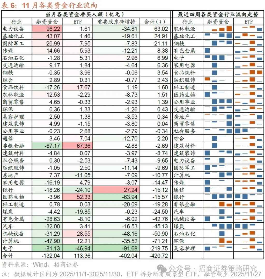 结构上,11月宽基指数ETF多数转为净赎回,中证1000及中证2000ETF净申购,行业类ETF净申购规模靠前的主要为中证医疗,证券、机器人、酒等ETF,煤炭、化工、国防及银行ETF以净赎回靠前。