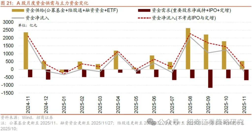 (2)基金发行与ETF申赎 11月偏股类公募基金发行规模有所回升,11月主动与被动偏股基金发行份额544亿份,较10月前值379亿份回升。2025年10月,股票型公募基金份额25年9月末增加657亿份,混合型基金份额减少127亿份,二者合计增加529亿份。考虑到当月新成立份额后,估算10月偏股类老基金净申购145亿份,净申购比例为0.22%。11月ETF净申购311亿份,对应净流入132亿元。