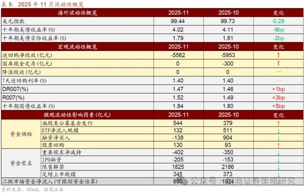 (2)外部流动性:美联储12月降息预期再度升温 美联储官员11月末连续放“鸽”,美联储12月降息预期再度升温。美联储理事沃勒表示,他主张在12月的议息会议上降息,因为他更担忧美国劳动力市场持续疲软。旧金山联储主席玛丽·戴利支持下月降息,因就业市场恶化风险大于通胀上升风险。同时,10月和11月的美国非农就业数据定于12月16日发布,11月消费者价格数据则将于12月18日公布,意味着美联储12月10日议息会议之前将无数据可参考。 美国经济数据同样显示降息可能性增加。美国劳工统计局周二公布的数据显示,9月PPI环比上涨0.3%,预期上涨0.3%,此前8月下降0.1%。剔除食品和能源的核心PPI环比上涨0.1%,预期上涨0.2%,前值下跌0.1%。ADP周二报告称,随着过去四周裁员速度加快,美国劳动力市场正显现进一步疲软迹象。过去四周私营企业每周平均减少13500个工作岗位。这较一周前公布的每周减少2500个岗位的数据呈现加速恶化趋势。美国人口普查局数据显示,9 月整体零售销售额环比增长 0.2%,低于经济学家预期的 0.4%;相比之下,8 月零售销售额环比增幅为 0.6%。
