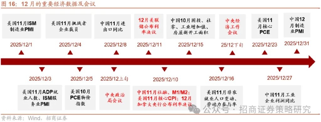3、大事前瞻:关注12月美联储议息会议,政治局会议和中央经济工作会议 进入 12月后,影响 A股市场的关键数据和会议时间点如下所示。海外方面,12月美联储议息会议将影响市场后续美联储降息预期。国内方面,12月将召开政治局会议和中央经济工作会议,目前市场对于政治局会议和中央经济工作会议预期较低,会议中超预期的表述是12月重点的交易方向。