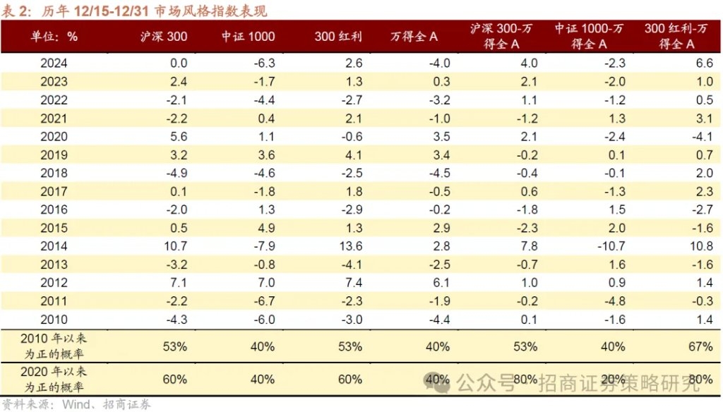 第二,12月下旬-1月,是上市公司年报业绩预告披露期,12月下旬有少量上市公司会披露年报业绩预告,使得市场开始交易年报业绩预期。这个阶段业绩波动较大的小盘股往往会面临一定的压力。 从指数表现来看,在12月中旬至12月末,沪深300/300红利上涨的概率较大,超额收益也相对明显,而中证1000涨跌互现,跑输指数的概率较大。