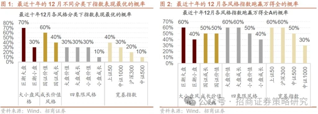 1、季节效应:年底重要会议+逐渐进入业绩披露期,12月大盘风格明显占优 2015-2024年的10年里,12月大盘胜率高于小盘。具体来看,风格方面,大盘优于小盘的比率是70%,跑赢万得全A的概率是60%;价值跑赢成长的概率是60%,但价值和成长跑赢万得全A的概率均为50%。两维度来看,大盘价值和大盘成长的胜率基本相当。在主要宽基指数中,上证50是占优概率和跑赢万得全A概率最高的指数。