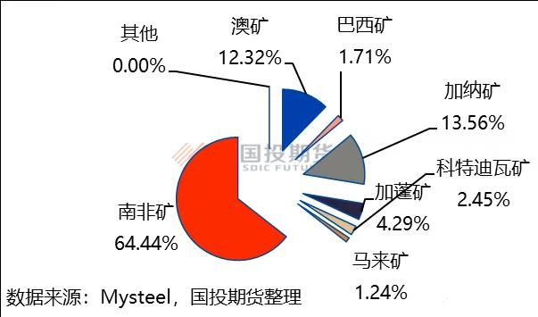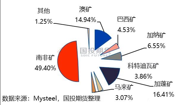 金属镁和出口方面需求整体变动不大,金属镁年内产量维持较高水平,硅铁出口需求在国际冲突的间接影响下也维持月均高出正常出口量的水平,这也是导致硅铁去库相对比硅锰更加顺畅的原因之一。 三、成本支撑下移 硅锰的利润逐渐下行,主要是受到上游利润一般导致的减量挺价以及下游利润水平较差引发的压价情绪。从数据来看,上游锰矿仍然面临一定的结构性因素导致锰矿价格难以让利。当下的锰矿港口库存水平和2019年同期较为接近,不过无法看到这么久的数据,考虑到近两年South32发运停摆以及Comilog减量发运的扰动,我们用2023年12月的数据和现在进行对比,以观测锰矿港口库存的变动。 2025年末天津港锰矿占比