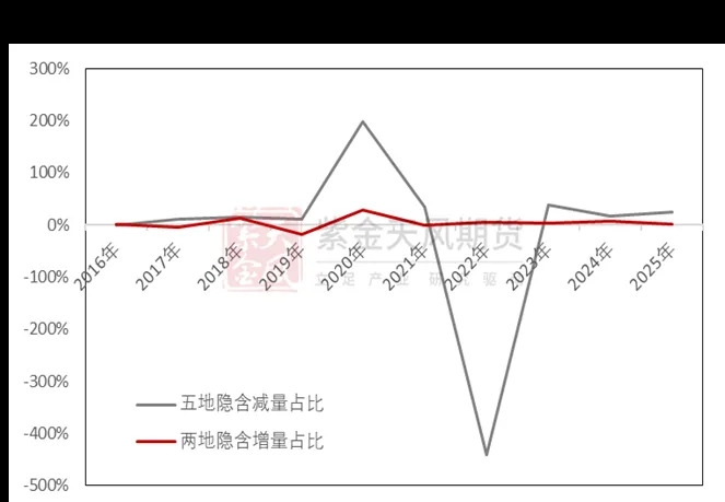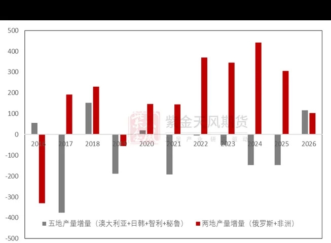 数据来源:紫金天风期货研究所 首先,是美元的汇率波动。2025年9月至12月期间,美元指数从102.5回落至96.5,同期LME三个月期铜价格由7850美元/吨攀升至8720美元/吨的历史高位。汇率传导机制主要体现在两个方面:美元计价商品的实际采购成本下降,刺激欧洲和亚洲等非美地区进口需求;美元贬值及其信用体系失效的可能促使投资者增加大宗商品配置以对冲汇率风险。 其次,是铜精矿加工费谈判僵局加剧了供应端的不确定性。2026年TC/RC谈判陷入停滞,反映出矿山与冶炼企业对未来供需预期的显著分歧。这种结构性矛盾在库存数据中得到印证:LME注册仓库库存持续去化,全球显性库存处于历史低位。值得注意的是,中国冶炼企业出口量超出市场预期,但受制于美国市场的"虹吸效应",库存补充速度仍滞后于需求增长。 最后,由于对美国关税的预期存在,市场对于L-C的价差存在较高预期,导致了CMX成为铜价的最强边际定价。由于前文以及做详细解释,此处不再展开。不过,美国市场需要注意的是,由于当下美国市场的定价已经脱离基本面本身,导致美国市场基本面失效,所以CMX的价格更多是给到关税预期的边际定价机制,关税预期几乎决定了CMX价格与LME的绝对价差区间。所面临的风险在于,一旦LME市场出现挤仓效应,且美国关税预期下降,则美国将重回基本面定价机制,过剩量级明显,依然存在风险。而由于美国的虹吸效应,海外非美地区26年依然面临挤仓可能性,期间或仍将出现阶段性高位升水。不过,需要谨慎一旦LME出现高升水后,吸引部分原先处于美国地区的锁定货源流出。这也意味着,明年市场间货源流动主要以海外非美地区与美国地区之间的货源轮换流动。 美国虹吸效应下,对中国进口影响多大? 今年以来,随着市场对于美国关税预期进一步发酵,且对明年基本存在10%-15%预期。这也意味着,考虑即使明年市场对关税敏感度较年初有所下降的情况下,对L-C的预期价差均值依然在700美元/吨以上,极值至少在1500美元/吨。在这种情况下,美国对全球可交割的品牌盈利性及吸引度达到最大化。 我们假设极端情况出现,所涉地区所有量级全部去往美国(涉及地区品牌为:智利、秘鲁、澳大利亚以及日韩)。同时,我们关注如俄罗斯、非洲等地对进口持续带来的增量补缺。往年来看,五地极端情况可假设趋同疫情年份2021年,当年五地产量减少19.12万吨,我国涉及五地进口量变动为-68万吨,隐含占比35.56%。2022-2025年期间,我国涉及两地(俄罗斯+非洲,下同)隐含平均占比4.97%。同理,2026年五地产量变动增加11.69万吨,两地产量增量10.23万吨,假设进口变动与21年完全趋同,则五地进口减量预计为61万吨(25年预计五地进口总量-预期增量),两地增量为1万吨(考虑去除部分非洲货源流向欧洲地区量,与25年趋同),则26年中国进口量极限下降量级约为60万吨左右。但考虑中国地区实际外贸长单签订情况带来的浮动量及非洲发往中国实际增量,故我们预期26年中国精炼铜进口量下降量级在30万吨左右,即年度进口量给到312万吨。(更多详细数据,请关注我们12月下旬推出的铜年报)