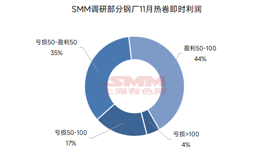 数据来源:SMM钢铁 利润方面 据SMM调研的钢厂生产热卷即时利润情况来看,当前多数钢厂即时利润集中在盈亏边缘区间,较11月利润水平再次收窄;细分来看,约5%的钢厂反映当前利润亏损>100元/吨,约10%的钢厂反映当前利润处于亏损50-100元/吨;58%的钢厂处于盈亏边际平衡状态;16%的钢厂反映当前利润处于50-100元/吨区间;11%的钢厂反映当前利润处于50-100元/吨区间。 图5:SMM调研部分钢厂近2月热轧即时利润情况