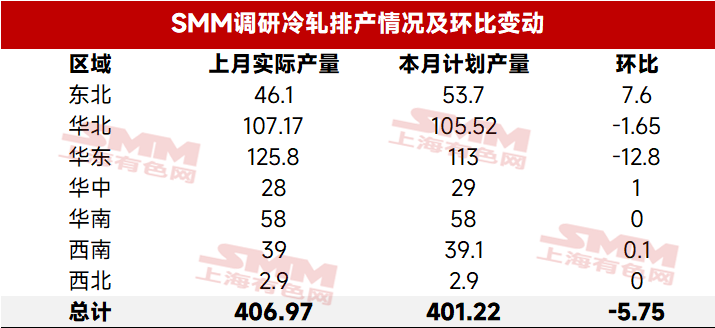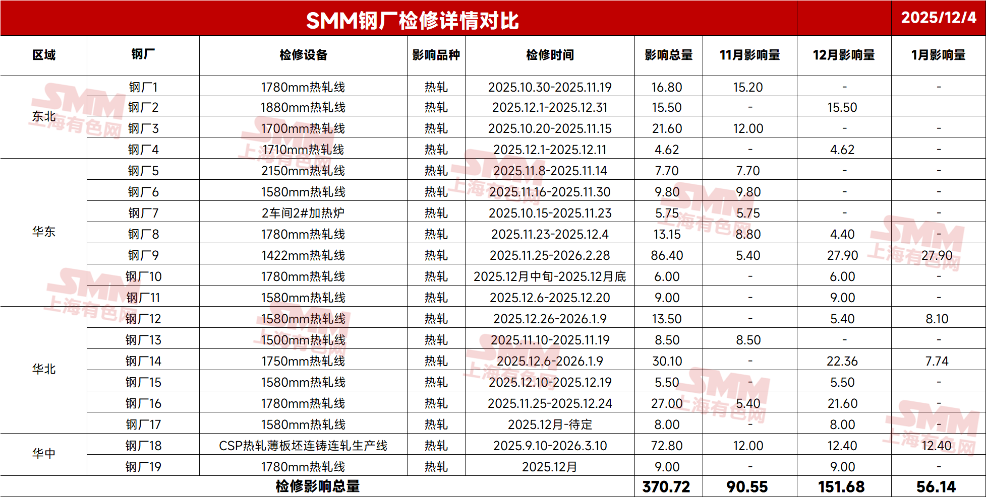 数据来源:SMM钢铁 检修方面 12月热轧检修影响量暂为151.68万吨,环比上月增加61.13万吨。目前发布的检修集中于东北、华东、华北及华中区域,后续情况SMM将持续跟踪,具体检修明细见下表: 表3:SMM钢厂热轧检修