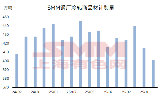 | 报告品种:热卷 原文链接:https://mp.weixin.qq.com/s/nH7paI_o78qWpcnWlLYDRQ?scene=1&click_id=1 SMM冷轧排产:12月钢厂冷轧排产小幅下降 据SMM最新跟踪显示,31家冷轧板卷主流钢厂本月冷轧商品材计划量总计401.22万吨,较上月实际冷轧商品材产量减少5.75万吨,降幅1.4%。 日均来看,12月天数较11月多1天,12月冷轧商品材日均排产为12.94万吨,环比上月冷轧商品材日均实际产量下降4.6%。 表1:SMM钢厂冷轧商品材计划量环比变动