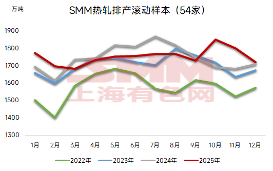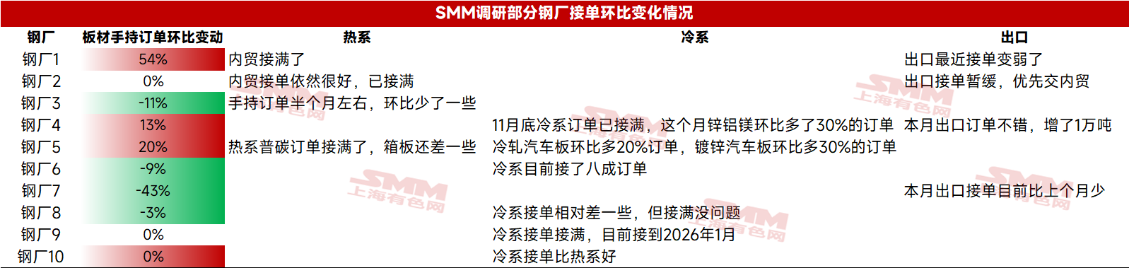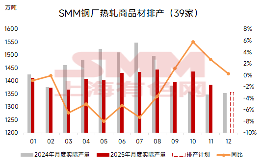 数据来源:SMM钢铁 总结 12月钢厂热轧商品材排产环比上月下降2.0%,由于12月天数多于11月,本月热轧日均排产环比上月实际产量下降5.2%,受北方、华东及华中多家钢厂检修影响,12月热卷产量环比下降,供应压力有望缓解; 需求方面,进入淡季,房建及机械行业开工情况预计逐步转弱,家电行业来看,据产业在线最新发布的三大白电排产报告显示,2025年12月空冰洗排产合计总量共计3018万台,较去年同期生产实绩下降14.1%,汽车行业来看,12月作为全年的收官月,在政策尾声效应和年底销量冲刺叠加下,汽车行业需求有望延续强韧性。整体来看,淡季背景下钢材消费释放承压,12月板材需求预计对比11月窄幅下降,库存有望延续去化,但降幅慢于往年同期。 其他方面,“十五五”开局之年,近期宏观预期明显升温,受此影响下,年末热卷价格存在上涨机会;然而,高库存背景下,终端实际需求仍以按需采购为主,价格难以形成宏观与产业的共振走强,预计12月冷轧、热轧价格重心环比上移,但幅度有限。 七禾带你去调研,最新调研活动请扫码咨询