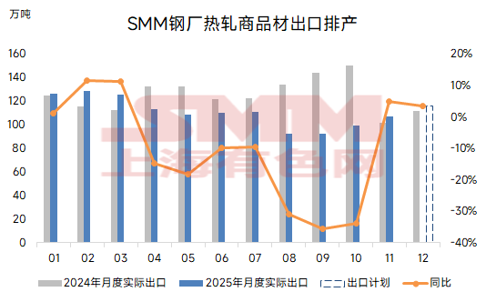 数据来源:SMM钢铁 据SMM调研,截止12月4日,钢厂内贸订单基本接满,其中,板材接单情况好于建材,钢厂冷系接单情况略有分化,后续接单情况SMM将持续跟踪。 外贸:本月热轧板卷出口计划量115.7万吨,较上月实际出口上升9万吨,环比增幅8.4%;12月国内钢厂热轧出口计划量环比上月小幅上升,出口展现较强韧性,从区域来看,临近年底,部分东北钢厂冲刺年度出口目标,叠加价格竞争优势较强,本月出口计划量延续高位,华东、华北及华南钢厂出口计划量维稳为主。 新订单方面,据SMM最新调研了解,当前多数钢厂出口订单船期为1-2月,12月首周出口接单小幅走弱,主要与近期价格拉涨后,海外询盘意愿一般,叠加部分钢厂内贸接单及利润相对更好,优先交付内贸订单有关。 图4:SMM钢厂热轧出口计划量与实际出口