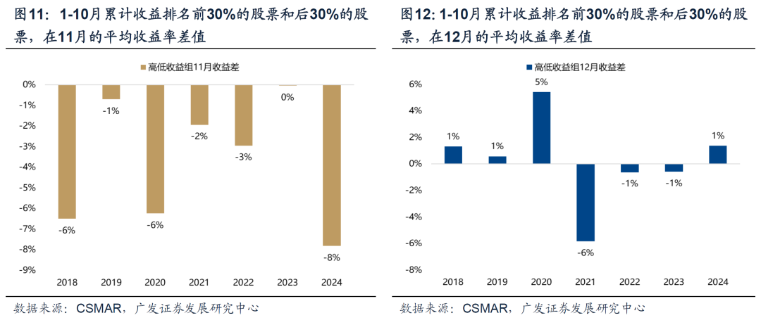 (三)结合历史经验,如何看本轮牛市主线在跨年及春季躁动的表现? 1.18年以来,前期表现领先的股票在年底考核期往往阶段性跑输,今年也属于正常波动,12月扰动逐渐出清 机构出于年末考核压力,倾向于兑现浮盈、锁定收益,尤其是在浮盈积累较多的年份,机构高持仓组合年底往往出现一定兑现。 因此18年以来,11月前期收益表现最好股票跑输最差股票;而下图显示,12月抛压相对减弱、扰动逐渐出清。