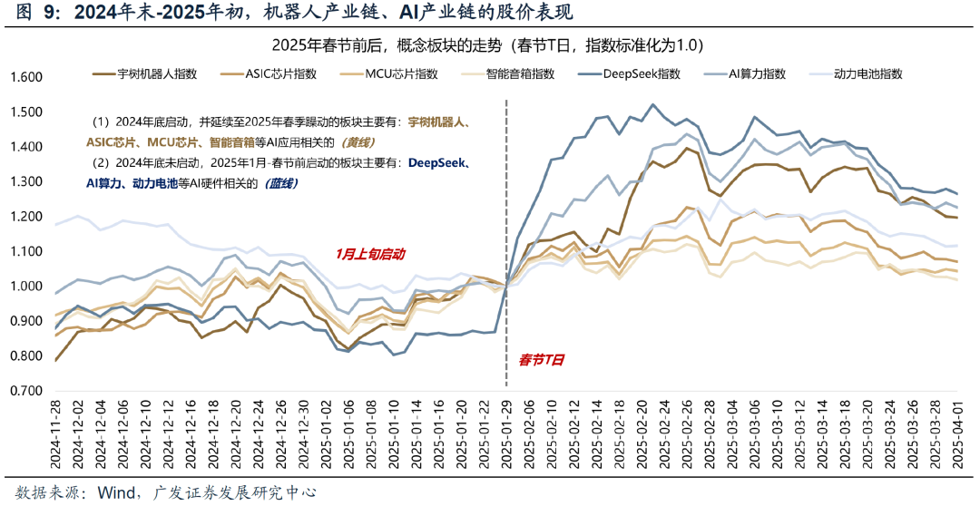 其次,参考今年AI的表现,我们重点梳理了2010年以来几轮典型的产业主线案例,由于景气预期上行、股价表现基本上贯穿当年,我们考察这些行业在跨年时期、春季躁动的表现—— ①2011年,新型城镇化消费升级时期,白酒;②移动互联网时期,2013-2015年的计算机传媒;③16年供给侧改革时期,煤炭建材;④16-17年棚改货币化时期,白酒;⑤19-20年全球半导体产业周期,电子;⑥20-21年,新能源渗透率提升的电新;⑦24年AI产业周期的光模块、电子。 对于上述几轮典型的主线板块,跨年及春季的市场表现,核心结论如下: (1)产业主线年末出现调整:当年的产业主线,在年末往往会有调整,年内的指数高点基本上落在10-12月(下表列3),或与各类资金进入年末决算、偏向于落袋为安,以及年末景气预期扰动有关。 (2)但回撤程度有限:如下表列5,跨年前后产业主线的最大回撤,13段案例平均回撤12.6%,不超过我们在此前报告中总结的历史牛市经验,牛市主线平均回撤20个交易日、平均回撤幅度18%)。 (3)跨年至春季躁动重拾上涨:经过短暂的回撤,12月-1月,产业主线有望重新进入新一轮的“春季躁动”区间,在春季躁动区间平均涨幅37.9%,涨幅中位数是26.7%,即春季躁动仍有非常不错的股价表现。 (4)且大多数领先于市场整体启动:我们选择的8年春季躁动案例中,有5年案例——14年计算机传媒、15年的计算机传媒、18年的白酒,20年的半导体、21年的新能源,产业主线是领先于市场的春季躁动上涨的,约领先了20天至1个月。 (5)产业主线率先上涨、且相较于市场获得超额收益,前提是景气延续高增区间:下表附上了当年主线行业的年报利润增速、一季报增速,可以看到多数保持在强劲增长且进一步提速的区间,投资者对于主线板块的景气预期得以延续。