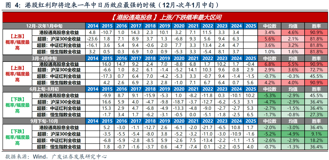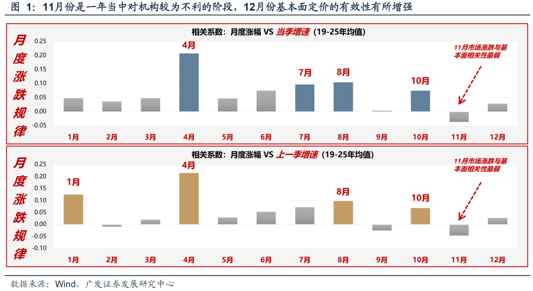 | 一、本期话题:产业主线,如何跨年、如何躁动? (一)通过历史数据统计,总结跨年前后市场整体的“日历效应” 1. 11月的市场特征:最不基本面的一个月 过去20年,wind全A的上涨概率为67%。对于以基本面为核心投资逻辑的机构来说,是最难操作的一个月。因为历年规律来看,11月的市场涨跌与基本面相关性最弱。 2. 12月的市场特征:大盘、红利、金融板块胜率占优 过去20年,市场在12月涨跌各半,wind全A的上涨概率为57%。但是,相较于11月“最不基本面”,进入12月之后,基本面定价的有效性会逐步加强。 此外,每年12月的两个关键会议召开,是我们把握政策基调、布局跨年行情的依据。 风格方面,12月大盘表现优于小盘,红利风格会阶段性占优,金融板块的平均涨幅居前(非银、银行)。年末考核期临近,各类资金诉求出现分歧、险资等机构进行资产再均衡,从而带动红利、金融等稳定类行业的表现;此外,年末监管可能加强、强化蓝筹风格(比如2016年底限制壳资源炒作、2023年底-2024年初杠杆资金暴雷)。 港股也是类似,港股红利即将迎来一年中日历效应最强的时段(12月-次年1月中旬)。2014年至今,港股通高股息全收益指数在12月-次年1月中旬具有较高的上涨概率和超额收益概率:绝对收益上涨概率90.9%,涨幅中位数和均值分别为3.4%和4.6%。相较于沪深300全收益:超额收益的概率为81.8%,超额收益中位数和均值分别为5.6%和2.1%。 3. 跨年进入1月后:市场定价年报预告,小盘承压,蓄力“春季躁动” 过去20年,市场在1月上涨概率不高,wind全A的上涨概率仅为43%。 其中一个原因是受到了年报预告有条件强制披露的影响,部分年报预告承压的公司影响市场的风险偏好,也给小盘股带来了调整压力,国证2000在1月的上涨概率仅31%。 4. 春节到两会区间,以及2月份:春季躁动正式开启,小盘风格和成长板块主导 一年当中风险偏好最高的区间:过去20年,2月份国证2000指数的上涨概率87%,【春节到两会】的上涨概率为94%。成长风格、电子/计算机/非银等行业的平均涨幅最高。 历史上春节后通常流动性因素回暖、强化小盘风格,微观流动性来自活跃交易资金的回归、宏观流动性来自降准降息等宽货币基调。