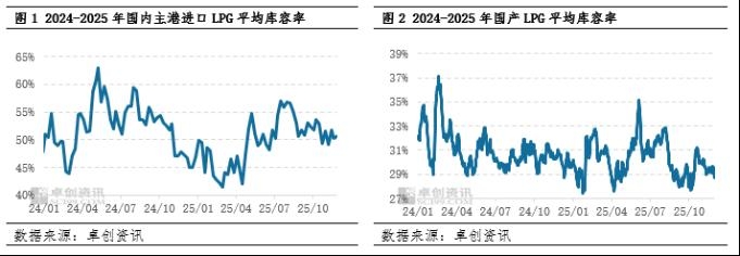 | 【导语】11月国内液化气产销节奏良好,炼厂库容率环比有所下降,但码头到港量环比增加,导致进口气港口库存率有所上升。12月来看,民用气在成本支撑与弱需求博弈下,上游控库为先,价格或横盘整理;醚后碳四则先受基本面疲弱压制,后随假期需求释放而有望企稳反弹。 国产气商品量减少 炼厂库存震荡下降 11月国内液化气炼厂库容率震荡收低。截至11月30日统计数据显示,LPG炼厂月末库容率为28.75%,较上月末相比,下降1.12个百分点。 企业停车降幅现象较多,商品量显著下降。11月国内液化气商品量预估值为159.58万吨,环比下降5.75%;日均商品量为53194吨,环比减少2.27%。商品量下降的主要影响因素为:华东中化泉州装置提前检修、镇海乙烯本月后期开工液化气外销量减少,沿江地区保持偏低负荷运行,东北辽阳及吉林石化减产,华南广石化进入检修期且广西石化下游装置开工后液化气外销量减少,西部宁夏地区部分炼厂检修及资源自用,共同导致国内液化气商品量下降。当然,山东华星石化复工,华东江苏新海检修恢复,抵消部分供应减量。 需求稳中偏弱,呈现“有支撑、缺驱动”的特点。民用气受益于高成本支撑与气温下降带来的终端刚需,心态稳健;醚后碳四虽因烷基化开工率上升而刚需稳健,但价格上涨已侵蚀下游利润,抑制了进一步采购意愿。整体来看,月内刚需尚可,但缺乏持续上行动力。 到港量增但需求平淡 港口库存有所上升 进口气库容率小幅升高,截至11月20日统计数据显示,本月末国内主港平均库容率为50.22%,较上月末均值升高0.86个百分点。 码头到港有所增加,截至11月24日监测数据显示,本月国内主港码头VLGC到港量(含预计到港量)约284.35万吨,预计较10月实际到港量增加15.43万吨。华南合计到港量71.45万吨,华东120.4万吨,山东76.1万吨,华北7.6万吨,东北8.8万吨。 需求表现分化下刚需存在支撑但整体动力不足。11月CP价格回落对市场形成一定抑制,虽然折合到岸成本价格未出现明显回落,但对国内市场支撑不足。再者,天气渐凉利好终端燃烧刚需,但由于PDH装置利润表现欠佳,导致开工负荷率有所回落,进一步牵制对丙烷资源的化工需求。但是,异丁烷脱氢装置开工负荷率维持高位,对进口混合丁烷刚需支撑较稳健。