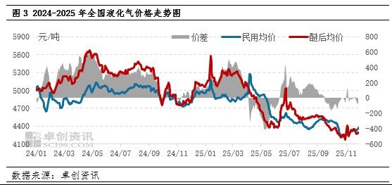 供需与成本博弈下 液化气市场走势分化 库存水平是市场供需、心态、原油及外盘等多方因素相互博弈的结果,而库存压力的高低会进一步对液化气价格走向形成影响。 从价格走势来看,11月国内液化气市场走势存在分化,主要受供需与成本博弈主导。民用气方面,虽然CP公布下跌,但贴水高企使进口成本仍处高位,对市场心态存在支撑;叠加市场供应量有所缩减,上游库存控制难度不大,尤其中上旬市场产销向好,上游库存消耗较可观,助力价格有所推涨,中下旬市场产销转弱导致库压回升,价格走势表现震荡。醚后碳四则受制于烷基化利润转亏与油品需求疲软,价格冲高后显著回落,但月内由于供应量不大,上游库存压力多数时间处于可控状态。