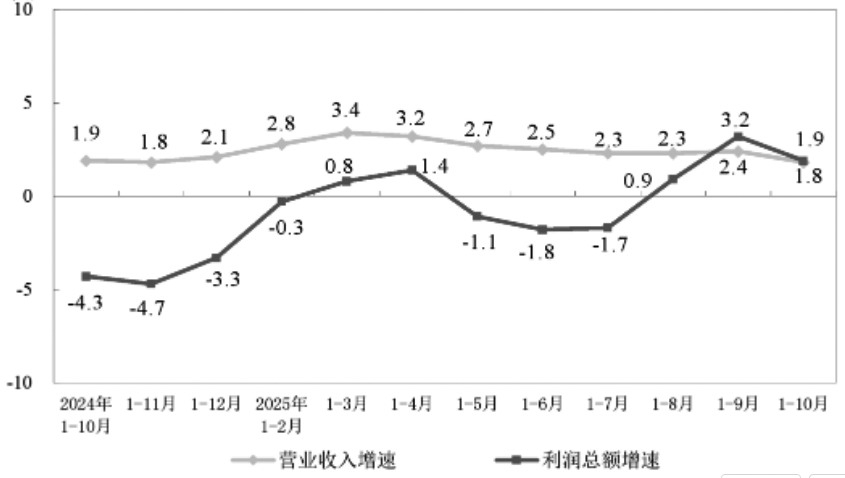 图为中国官方制造业PMI(单位:%) 企业盈利方面,今年1—10月全国规模以上工业企业实现利润总额59502.9亿元,同比增长1.9%,增速较上月回落1.3个百分点。其中10月规模以上工业企业利润同比下降5.5%,时隔两个月再次转负。从行业分类看,煤炭、石油、天然气开采等上游原材料加工业利润同比降幅继续收窄,通用设备、专用设备、仪表仪器等装备制造业利润同比增速放缓,纺织服装、家具、化学制品等下游制造业利润同比降幅扩大。1—10月产成品存货同比增长3.7%(前值为2.8%),增速连续两个月回升。相关数据表明,受去年同期基数抬升、需求边际减弱等因素影响,规模以上工业企业利润同比增速放缓,不同行业之间的利润结构出现分化。在“反内卷”和淘汰落后产能政策推动下,新能源、有色金属、煤炭等行业价格回升,有助于上游原材料加工业利润修复。随着大规模设备更新和消费品以旧换新政策效用的下降,家电、移动通讯、消费电子等行业利润增长放缓。由于终端需求不足,下游企业经营压力仍较大,生产成本难以向终端消费者传导,不得不主动减少产量和降低库存。