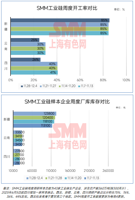| 报告品种:工业硅 原文链接:https://mp.weixin.qq.com/s/GV55AZlnlVta5fmUH0JACQ?scene=1&click_id=9 根据市场反馈了解,11月28日至12月4日: 新疆地区样本硅厂周度产量在41420吨,周度开工率在85%,较上周环比变动有限。近一周新疆个别硅企工业硅有新增复产情况,因时间较短周内产量增幅不明显,预计下周新疆样本产量继续表现上行。 云南样本硅企周度产量在2880吨,周度开工率25%,较上周下降。样本选取原因云南样本硅企周度开工率高于地区总开工率。云南11月开工率本就较低,叠加12月部分在产硅企进一步减产,使得云南开工率下降。云南地区开工率已降至同期极低水平。 四川样本硅企周度产量为3010吨,周度开工率在26%。样本开工率较上周下降。抛去样本内大厂,剩余硅企开工率降低至8%附近。四川由平水期转向枯水期,当地部分硅炉在11月底减产,使得开工率下降。