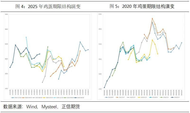 四、期限结构反映市场预期 当市场供需预期发生变化时,期限结构的形态会相应调整,从而提供了一个观察预期是否正在兑现的窗口。从逻辑推演来看,当价格处于底部出现反转时,市场预期逐步由宽松转向紧张,对应的期限结构往往从陡峭Contango转向平坦Contango,最后反转为Back结构。从数据验证来看,回顾2020年鸡蛋期限结构的演变过程,基本符合上述逻辑的推演。今年以来,鸡蛋期限结构持续呈现Contango状态,而淘鸡进程的犹豫使得Contango 结构呈现陡峭化趋势。在产能去化实现供需再平衡之前,鸡蛋期货近低远高的格局有望延续。