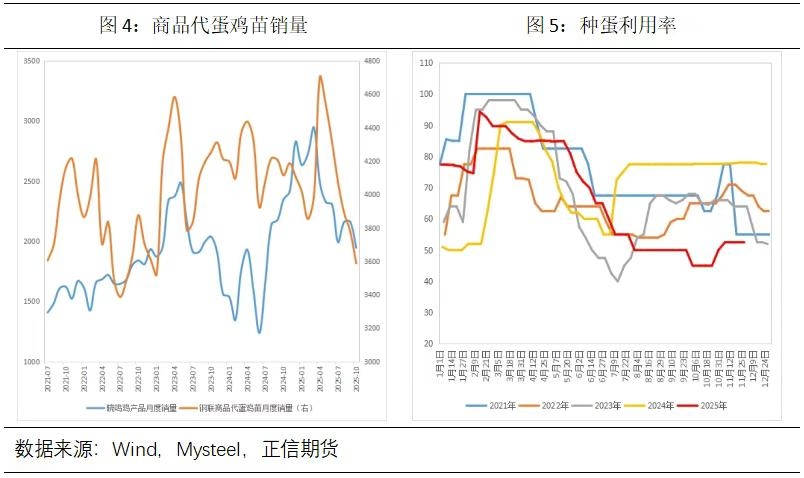 三、行业整体补栏下行拐点已现 2025年1–8月行业持续输出鸡苗,6月后京系补栏节奏有所减缓,而海兰系接续补栏,但9月起海兰系出现亏损导致补栏意愿实质性下降。从种蛋利用率来看,2025年5月前鸡苗入孵率维持高位,但6-8月呈现快速回落,9月起持续处于近五年同期最低水平。9月份开始出现部分种蛋转为商品蛋,反映出鸡苗销售受阻。目前部分头部企业产能满负荷,但中小孵化企业大量关停,行业整体补栏拐点已现。