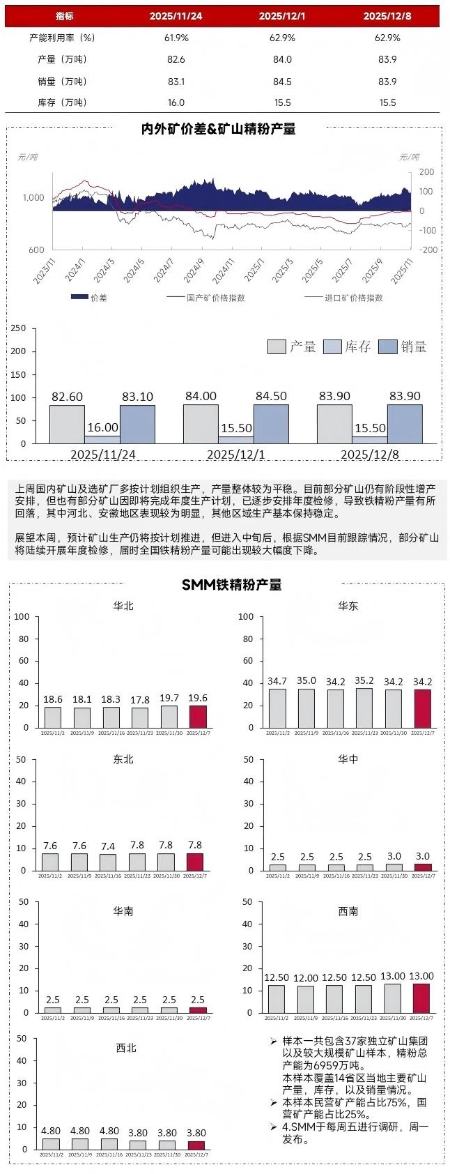 | 报告品种:铁矿石 原文链接:https://mp.weixin.qq.com/s/RLe_c-VY3buF1lgM1ctOBw?scene=1 根据SMM最新统计,上周国内矿山产能利用率维持在62.9%左右,与前一周基本持平;铁精粉产量为83.9万吨,环比微降0.1万吨。同期,矿山铁精粉库存15.5万吨,亦保持平稳。 上周国内矿山及选矿厂多按计划组织生产,产量整体较为平稳。目前部分矿山仍有阶段性增产安排,但也有部分矿山因即将完成年度生产计划,已逐步安排年度检修,导致铁精粉产量有所回落,其中河北、安徽地区表现较为明显,其他区域生产基本保持稳定。 展望本周,预计矿山生产仍将按计划推进,但进入中旬后,根据SMM目前跟踪情况,部分矿山将陆续开展年度检修,届时全国铁精粉产量可能出现较大幅度下降。