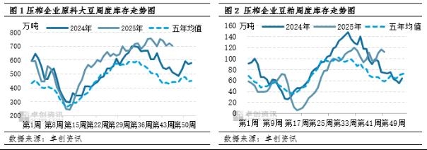 | 【导语】11月以来,豆粕市场下方受到成本支撑,上方受到供应宽松压制,现货一口价波动率明显降低,价格僵持难突破。根据卓创资讯统计历年价格季节性波动特点来看,12月现货价格下跌概率大于上涨概率,结合当前市场基本面,卓创资讯预计12月现货价格符合历史波动规律,价格有小跌预期。 供应端:去库持续后移+国储拍卖落地 根据中华人民共和国海关总署数据统计显示, 11月中国进口大豆810.7万吨,环比下降14.51%。1-11月累计进口量9709.1万吨,同比增加6.9%。原料供应方面持续表现宽松,支撑国内生产企业原料大豆库存高位难去库,截至12月5日当周,根据卓创资讯监测重点生产企业库存数据来看,原料大豆库存为704.9万吨,去年同期数值为513.6万吨,五年均值为443.68万吨。豆粕库存为112.5万吨,去年同期数值为74.3万吨,五年均值为59万吨。企业去库节点持续后移,导致现货端价格重心处于低位水平运行。 12月8日,进口大豆拍卖公告落地,计划于12月11日13:30开展进口大豆竞价交易,首批数量为51.25万吨。叠加中国采购美豆节奏放缓,采购时间节点延期至2026年2月底。以及美国农业部发布的最新展望显示,美国农户可能在下一年度增加大豆种植面积。多重利空因素共振下,对国内豆粕市场近远月均带来宽松预期,传导至价格带来下行压力。近月成本支撑下价格表现相对抗跌,国内豆粕近强远弱价格结构延续。