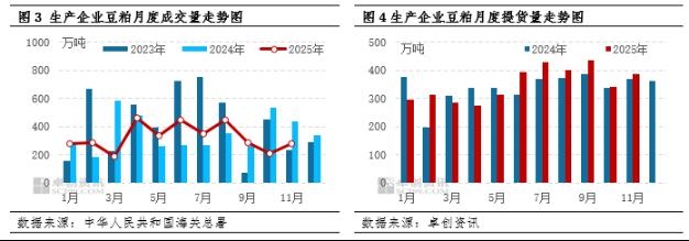 需求端:下游采购理性 一季度基差受欢迎 受现货供应充足以及远期原料不确定性较大影响,下游采购心态表现理性,现货多滚动采买,饲料企业库存主动增库意愿较差。从工厂成交数据来看,11月成交总量为276.3万吨,同比下滑36.92%。工厂催提力度下,提货数据环比改善。受远期原料供应不确定性影响,下游对2026年一季度基差成交意向走强,华东市场2026年1-3月以及2026年2-3月基差成交小幅放量,成交价格参考M601+0/10元/吨、M2605+240元/吨。成交主体为下游饲料厂,考虑到折算一口价价格不高,饲料企业安全边际相对较高,适量布局远期基差头寸。需求端来看,对现货价格整体呈现中性影响。