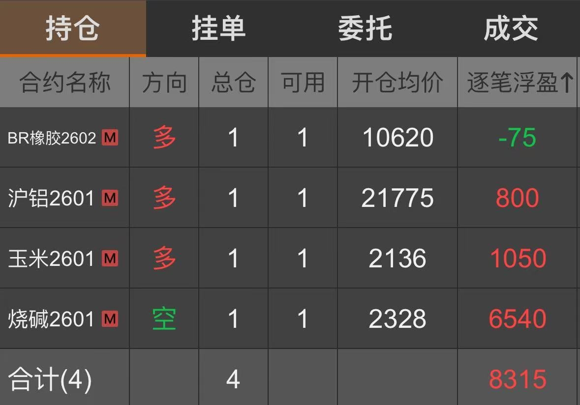 | 一、开仓总结 玉米:2025年11月4日,达到启动点的开仓条件,所以在14:51开多一手玉米2601合约,开仓价为2136。 烧碱:2025年11月14日,达到启动点的开仓条件,所以在14:51开空一手烧碱2601合约,开仓价为2328。 苯乙烯:2025年11月26日,达到启动点的开仓条件,所以在14:57开多一手苯乙烯2601合约,开仓价为6537。 纯苯:2025年12月5日,达到启动点的开仓条件,所以在14:56开多一手纯苯2603合约,开仓价为5481。 沪铝:2025年12月9日,达到启动点的开仓条件,所以在14:57开多一手沪铝2601合约,开仓价为21775。 BR橡胶:2025年12月10日,达到启动点的开仓条件,所以在14:49开多一手BR橡胶2602合约,开仓价为10620。