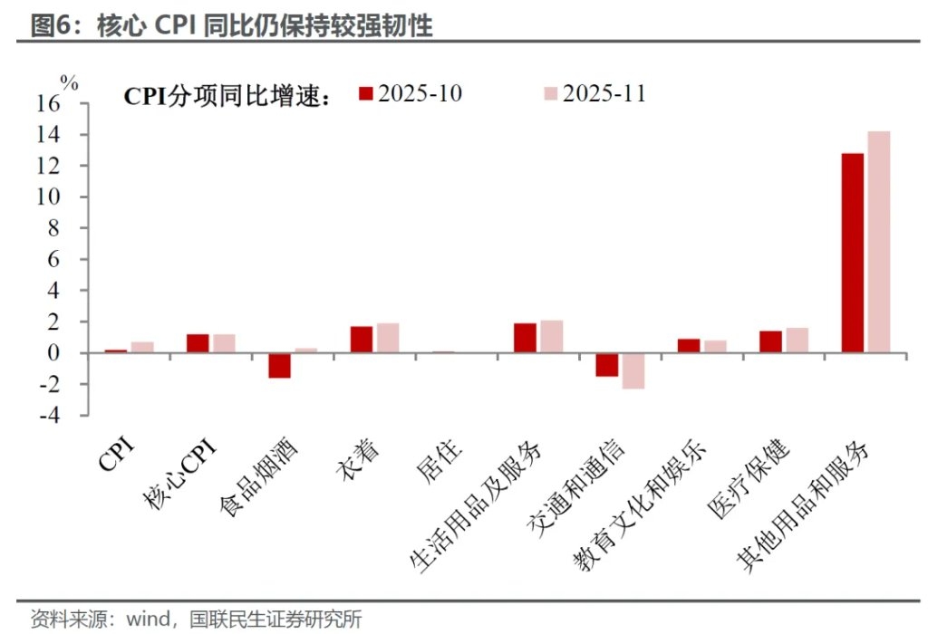 值得关注的是,即便剔除食品价格的短期波动,核心CPI依旧保持充足韧性。尽管受国庆节后需求季节性回落影响,核心CPI环比小幅下降0.1%,但仍高于历史同期水平,同比增速持平10月1.2%的高增长。 核心原因在于,一方面,受国际金价上行传导,国内金饰品价格延续回升态势,对核心物价形成支撑;另一方面,前期扩内需政策效果持续显化,家用器具与服装等商品价格延续上涨;此外,服务消费回暖势头未改,其中机票、家政、餐饮等细分领域价格更是维持较高同比增速,成为拉动服务类物价的核心动力。