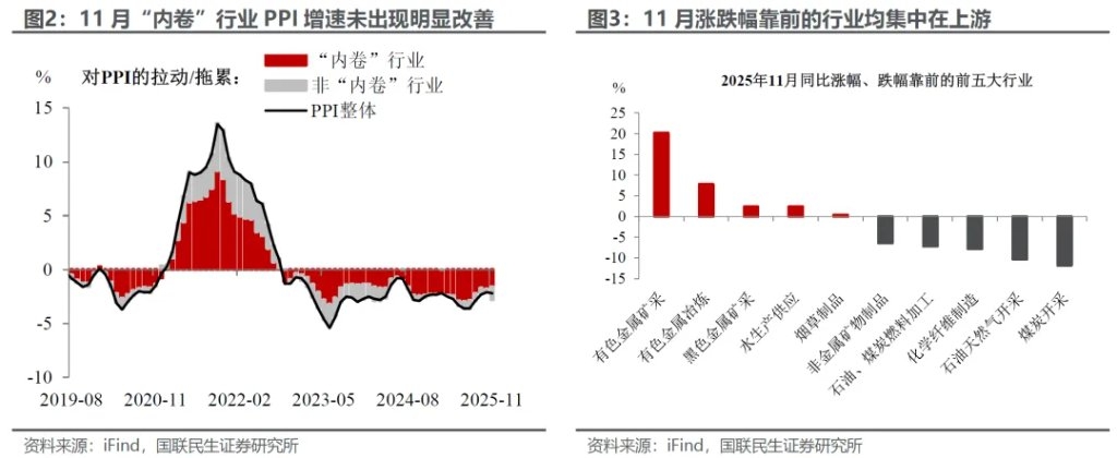 看似微小的数据“预期差”,实则是重要的政策节奏变化。11月PPI同比增速实际录得-2.2%,略低于-2.0%的市场预期。这一偏差的背后,主要反映了年末“反内卷”政策步伐有所放缓。我们测算显示,11月“内卷”行业的PPI同比增速与上月基本持平,未能如前期那样显著收窄其对整体价格的拖累,这最终导致PPI同比增速不及预期。 聚焦于行业来看,11月涨跌幅靠前的五大行业均集中在上游。一方面,上游行业涨跌互现,预示不同产业链(如新能源、基建、化工等)的需求分化正在加剧;另一方面,上游行业是当前经济波动的“高敏区域”,其走势可作为观察政策效果、全球资源行情及国内工业复苏节奏的窗口。当然,这也从侧面说明了中下游制造业、消费端对原材料价格变动的传导仍不顺畅,或需求复苏力度不一。