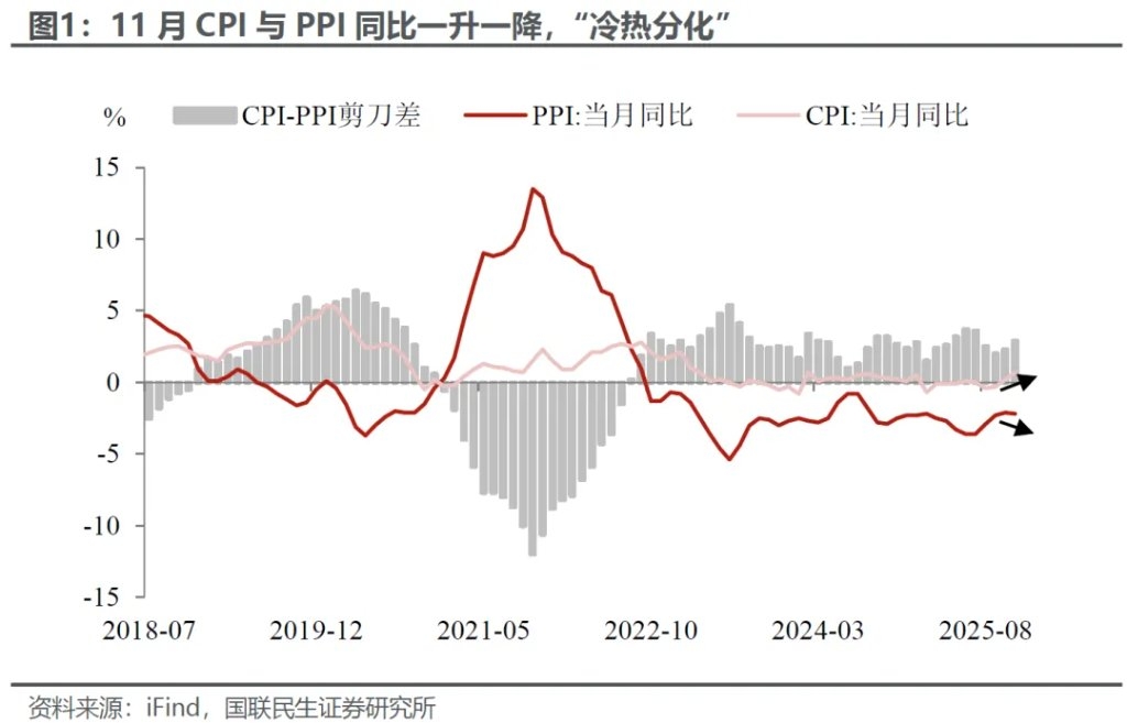 | 11月通胀数据中,CPI的“升”与PPI的“降”似乎形成了鲜明对比。一升一降的背后,构成了当前宏观态势的鲜明剪影——不仅是年末政策在“提振内需”与“反内卷”之间的权衡与温差;更深层次看,它揭示了当前经济复苏中的结构性矛盾:CPI回升基础并不宽广,更多依赖于季节性食品、金价的价格修复;而PPI的下降或表明“反内卷”政策有待到明年进一步优化加码。具体来看:
