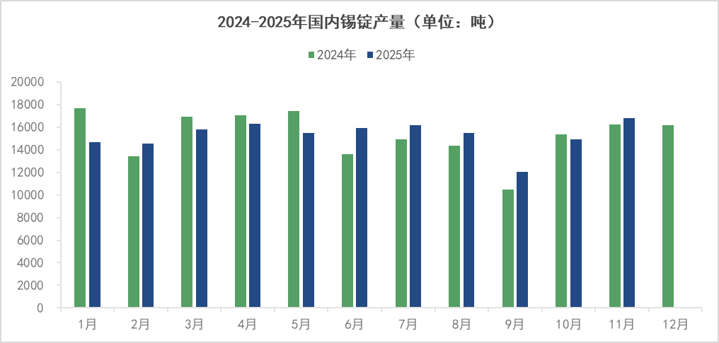 2025年1-10月我国累计进口锡矿砂及其精矿103016吨,同比减少25.54%;其中自缅甸累计进口锡矿砂及其精矿21807吨,同比减少69.80%,自刚果(金)累计进口锡矿砂及其精矿26615吨,同比减少1.31%。锡矿供应偏紧延续,预计年内国内锡矿供应偏紧格局不改。 12月来看,尽管原料供应仍偏紧,但大部分冶炼厂维持稳定生产,预计精锡产量将维持在1.5-1.7万吨区间,产量波动有限。 七禾带你去调研,最新调研活动请扫码咨询