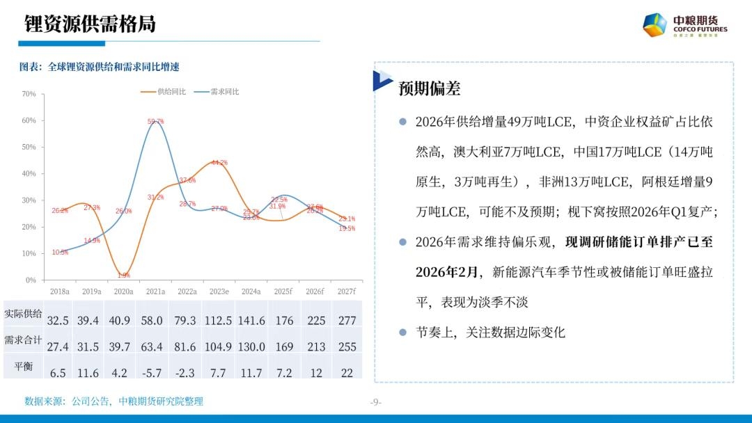 | 2025年碳酸锂市场处于供需双强格局,供给同比增速小于需求,在供给释放周期仍未走完的大背景,结合2026年强需求预期,供给的弹性会被放大,短期的供需错配导致价格维持高位震荡,关注边际释放节奏。 一、宏观定位与微观数据