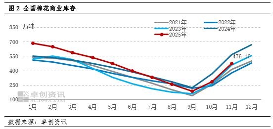 轧花厂新棉销售进度较快,卖压逐步释放 11月棉花商业库存继续上升,维持在近五年次高位。11月处于棉花集中加工上市期,截止到11月30日,2025/26年度全国棉花累计公检量为429.94万吨,商业库存延续累库存趋势。据卓创资讯的监测,截至11月底,全国棉花商业库存上升至476.16万吨,较上月末增加190.94万吨,环比增幅66.94%,但同比下降15.98%。2024/25年度后期,棉花商业库存下降较快,导致下游纺织企业原棉库存偏低,本年度新棉上市后,纺企刚需补库需求增加,另外轧花厂销售皮棉积极性较高,随着加工、公检推进,大部分轧花厂销售进度快于去年同期,且部分已销售完毕,棉花市场卖压逐步释放。