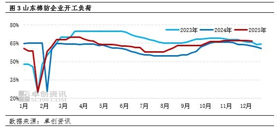 中美贸易互降关税,棉花需求预期偏乐观 10月30日中美釜山会晤后,美方取消10%“芬太尼关税”并暂停24%“对等关税”一年,显著改善了外贸环境。政策红利已开始释放,部分企业高附加值面料订单增长,棉纺企业开工率也有所提升,据卓创资讯监测,12月4日当周,山东棉纺企业开工负荷上升至近三年同期最高位,为67.25%,同比提高3.85个百分点。后续将进入年前备货阶段,下游需求有望继续回暖。总体来看,2026年一季度出口端受到关税的压制作用减弱,内需方面在国内各项促消费政策、以及春节传统节日利多消费,另外新疆棉纺产能增加也将增加棉花消费,因此2026年一季度需求端预期偏乐观。