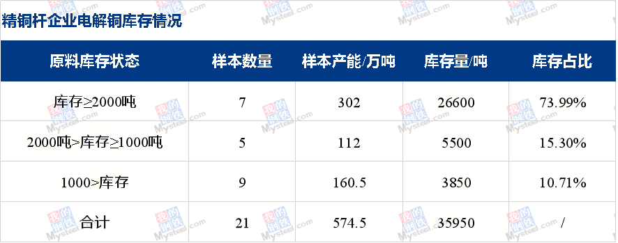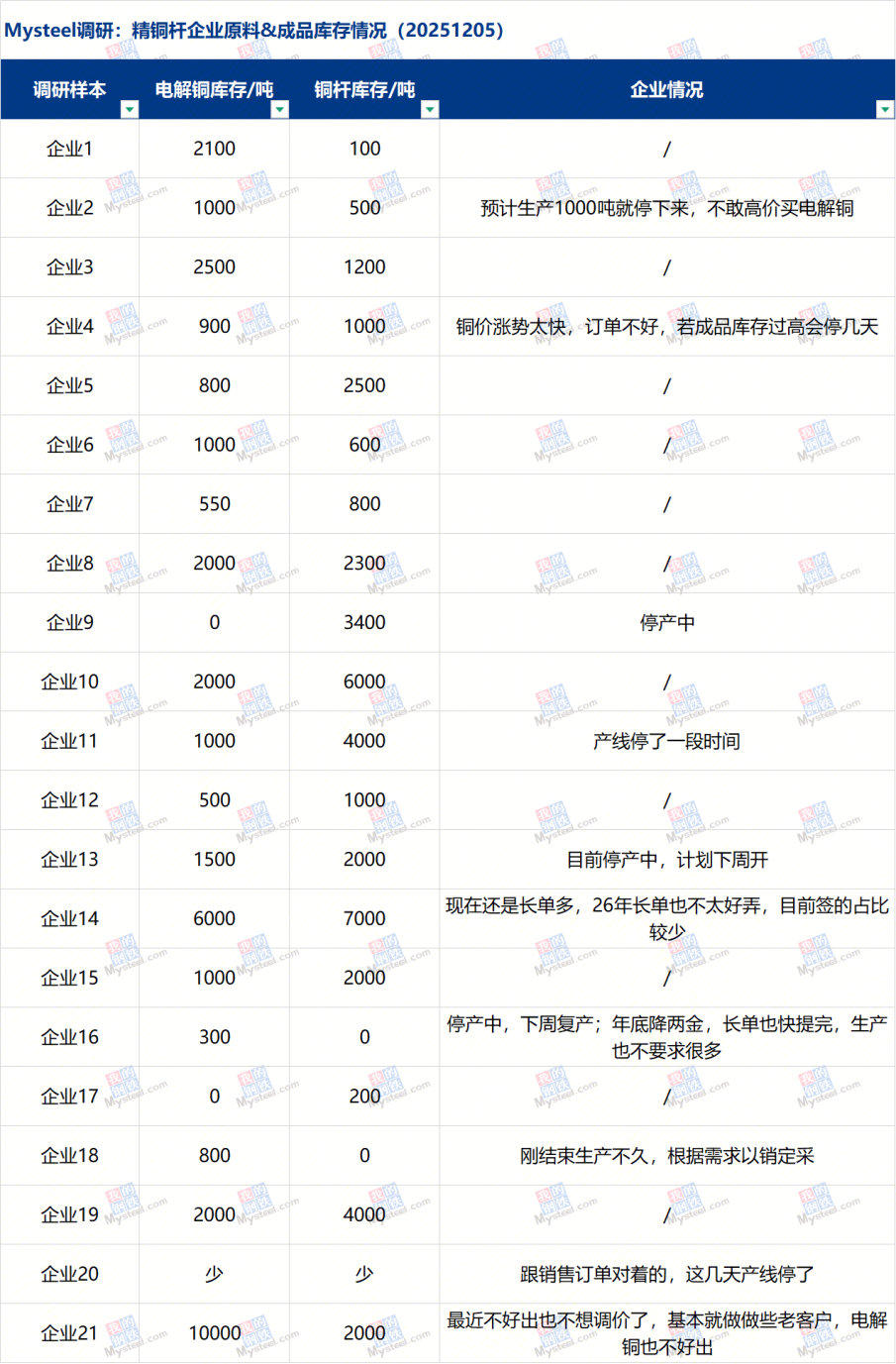 | 报告品种:铜 原文链接:https://mp.weixin.qq.com/s/f7hvoSWzT66oTBW309W_Eg?scene=1&click_id=20 目前铜价仍在持续上涨且不断刷新历史记录,绝对价格重心明显上移,部分区域精铜杆企业反馈正在面临订单持续减少、库存积压和后续减产的压力,为更好地了解目前精铜杆市场实际情况,Mysteel铜杆团队调研了21家精铜杆企业(年产能合计574.5万吨)最新的库存情况,调研结果如下(详细情况附于文末): 一、原料库存:提前储备、以销定采策略综合调整 调研数据显示,截至12月5日,样本企业厂内电解铜库存合计约3.6万吨。