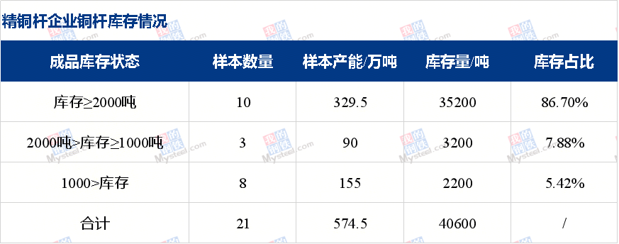 数据来源:Mysteel 其中,7家样本企业(年产能合计302万吨)电解铜库存皆在0.20万吨及以上,库存合计约2.7万吨,占样本总库存量的70%以上;该部分企业中多为大型铜杆生产企业,因产出高水平的需求,储备的电解铜数量略高于其他企业,属于正常库存水平,企业也反馈目前原料储备足够维持近期生产;但也有个别企业于前期购进了部分电解铜,避免后续铜价上涨过快而增加不必要的成本。 5家企业(年产能合计112万吨)以中型生产企业为主,其电解铜库存量维持在超0.10万吨但低于0.20万吨水平,库存合计0.55万吨;除个别停产企业为后续复产计划增补了部分原料外,多数企业表示有意控制原料库存水平。 9家样本企业(年产能合计160.5万吨)电解铜库存皆低于0.10万吨,库存合计仅不到0.40万吨,该部分企业中因有超1半数量以上目前处于停产状态或近期有停产计划,因此现阶段保持以销定采策略,考虑成本过高故电解铜储备量不高。 二、成品库存:铜杆流动性减弱企业累库现象较为普遍 (一)企业库存 调研数据显示,截至12月5日,样本企业厂内精铜杆库存合计约4.1万吨。
