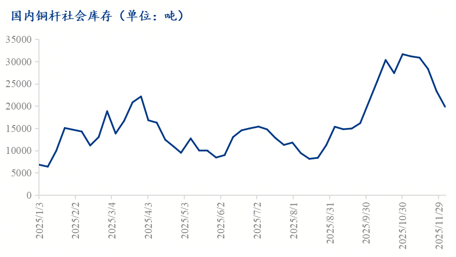 数据来源:Mysteel 其中,10家样本企业(年产能合计329.5万吨)铜杆库存保持在0.20万吨及以上,合计库存超3.50万吨,占样本总库存量的85%以上;该部分企业中有反馈称受高昂铜价冲击,零单交易下滑明显,目前基本以长单交易为主,缺乏订单支撑的情况下,成品消耗效率不高,因此有累库迹象,后续需要考虑停产降库的计划;其中不乏已经停产的一些企业,在早就限制成品产出的情况下,因市场交易活跃度下滑,依旧存在铜杆流通性偏低而造成高库存状态的现象。 3家样本企业(年产能合计90万吨)铜杆库存在超0.10万吨但低于0.20万吨水平,库存合计0.32万吨;8家样本企业(年产能合计155万吨)铜杆库存皆低于0.10万吨,库存合计仅有0.20万吨左右。该部分企业目前成品产出控制相对严格,且个别企还称生产到一定数量铜杆后将进行停产控量。 (二)社会库存 除了调研的部分精铜杆企业厂内库存外,Mysteel调研国内5省(市)合计12个仓库铜杆库存数据显示:截至12月4日,国内铜杆库存合计1.99万吨,较11月27日减少0.35万吨,整体库存量依旧略高于平均水准;虽环比有降库表现,却并不表示市场交易提升,而是由于入库数量减少,下游提货效率依旧不高。