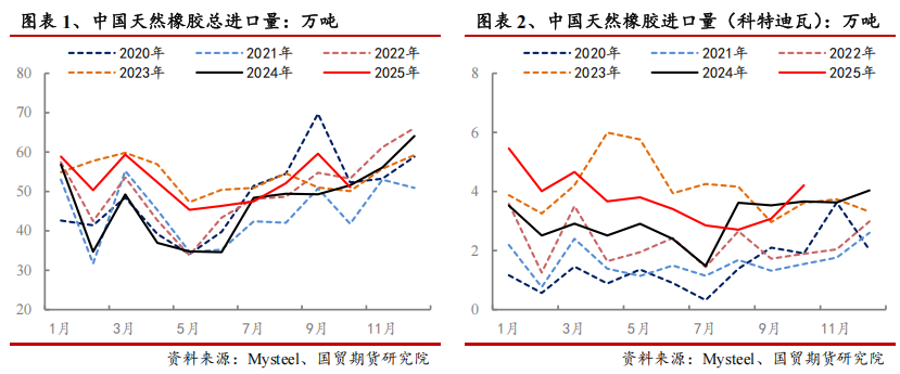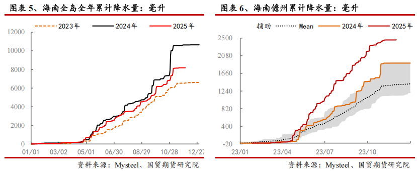 2024年台风“摩羯”的影响持续性地对2025年海南胶树树况及胶水产量造成影响。极端天气或导致胶树短期内掉叶情况增加,树势衰弱导致胶树容易出现病虫害现象,进而在割胶期容易引发黄叶病、落叶病等情况出现,影响胶水产出和干含水平。 从海南岛的降水量来看,今年主汛期降雨极端性偏强。岛上胶树主要生长区域在西线儋州-白沙片区,从数据来看全年降水量维持近5年来高位。持续性的降雨也同样导致年内割胶节奏放缓、进度推迟。即便海南岛西线受去年台风影响程度相对较小,降雨增加或对胶水产出量有微不足道的利多,但胶树长时间未接触光照和停割更从根本程度上影响整体胶水产出。