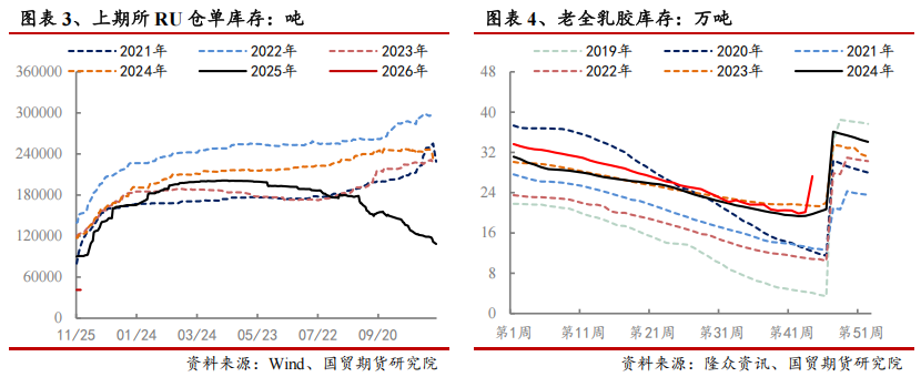 库存方面,二三季度收储消息传出导致盘面RU仓单持续下滑。11月集中注销期后,RU小计库存降至7.87万吨,创2012年11月以来新低,但市场对低量仓单不敏感。主要由于市场老全乳库存全年处于高位水平,价格处于中位区间导致市场多空方向不明朗,因此不乏有参与者通过国际油价和宏观情绪来预判未来胶价走势,呈现出较为混沌的交易氛围。
