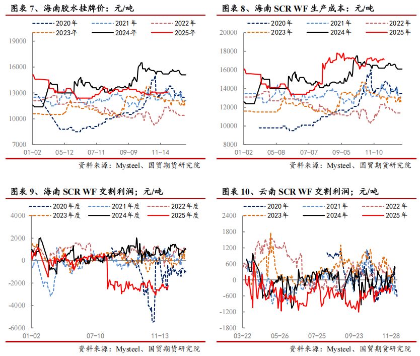 | 报告品种:橡胶 原文链接:https://mp.weixin.qq.com/s/pZeLLqZ2gKOcBShKeJE1Gw 调研背景 海南是国内最大浓缩乳胶及重要全乳胶产区。2024年受台风影响后,2025年气候异常持续导致原料供应紧张、胶价上涨,旺产季产量仍低于预期,叠加台风再度干扰,强化减产预期。临近停割期,产区生产状况及浓缩乳胶与全乳胶的产量互动将影响市场走势。 调研时间、地点 2025.11.21-2025.11.28(海口-临高-白沙-屯昌-琼海) 基本面概述 2025年全球天然橡胶市场并未如预期般迎来“产能周期逆转”,国内全年进口维持高位,叠加非洲等新兴产区供应增长,抑制了价格涨幅,市场对供应扰动的反应趋于钝化。 国内方面,收储导致RU仓单降至历史低位,但高企的老全乳库存使得市场对低仓单交易并不敏感,市场氛围较为混沌。 供应上,海南受持续性降雨及去年台风滞后影响,割胶进程受阻,但其原料胶水价格异常坚挺主因并非纯粹的基本面缩量,而是本地浓乳厂的高价收购,导致加工利润持续倒挂。 需求呈现分化:全钢胎需求具韧性,支撑干胶消费;而半钢胎及浓乳下游制品(如高端贴合制品、发泡制品)需求则相对疲软。 价差结构上,RU受仓单及天气升水支撑,NR则相对低估,同时合成橡胶产能投放致其与天胶价差扩至历史极值。整体来看,市场在多空因素交织下呈现供需紧平衡与结构性矛盾并存的格局。 调研总结 2025年海南天然橡胶产业正面临严峻的结构性困境。树龄老化、台风“摩羯”滞后影响及今年持续性降雨削弱了胶树产能与割胶进度;同时,高企的人工成本与激烈的原料竞争,特别是国营企业基于资金优势,进一步推高了岛内胶水收购价,造成了普遍的“价格倒挂”,浓乳及全乳胶产线持续亏损。下游需求分化,下游轮胎需求尚可支撑干胶,而浓乳制品需求相对一般。产业生态恶化,民营加工厂生存艰难,部分产能转向成本更低的云南或寻求海外原料,同时橡胶种植面积受槟榔等经济作物挤压而面临长期萎缩压力。短期内橡胶库存水平仍然承压,但中长期产能周期逆转逻辑或将逐步兑现。 策略建议 关注多NR空RU,多BR空RU策略。 一、调研背景 海南作为中国重要的天然橡胶战略生产基地,是国内最大的浓缩乳胶产区,也是仅次于云南的第二大全乳胶产区。2024年下旬,台风“摩羯”在海南登陆,对海南岛东部及中部部分区域的橡胶林造成显著破坏。进入2025年后,该地区天然橡胶主产区继续受到气候异常等多重因素影响,开割后原料供应持续紧张,推动海南胶水价格不断上涨。尽管7月至8月产区逐步进入传统旺产季,岛内原料产量出现阶段性恢复,但整体仍明显低于市场预期。随后,年内台风高发期带来的恶劣天气再度干扰割胶作业,进一步强化了国内天然橡胶减产的预期,对产业链供需平衡构成持续压力。 随着2025年临近尾声,海南天然橡胶停割期渐近,产区物候条件、割胶进展、加工厂原料收购与利润状况、浓缩乳胶与全乳胶的生产及订单情况,以及二者之间的产量互动关系,都将影响天然橡胶市场走势。为此,本次海南天然橡胶产业实地调研,通过一线走访获取业内直接信息,为橡胶产业链相关企业的采购决策、天然橡胶期现货市场分析提供可靠依据。 二、海南橡胶基本面情况 回顾2025年全年,年前市场所共识的“产能周期逆转”逻辑随着天然橡胶全年进口维持高位水平被阶段性证伪。尽管传统东南亚主要产胶国产量有所下降、进口量缩减,但部分贸易商通过转口贸易方式从其他渠道流入现象依旧存在,叠加新兴种植区域(如非洲科特迪瓦)橡胶产量及出口量逐年增加,因此今年全球橡胶价格涨幅不及市场预期,即便近期东南亚(泰国南部地区)洪水对盘面胶价影响程度减小,市场围绕宏观叙事,价格弹性相对有限。
