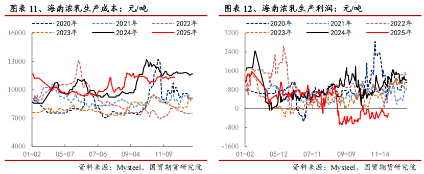 从原料胶水价格来看,海南岛对外公布的胶水收购价在13.1元/公斤,但浓乳厂胶水收购价从8月份后却维持在16元/公斤高位水平。原料价格坚挺并不能有效传导至成品全乳胶和浓乳价格上,因此可以看到WF和浓乳加工利润在下半年持续倒挂亏损的格局。这种情况只在海南岛有出现,云南胶水虽有受到市场部分影响,但整体胶水价格水平相对稳定,胶乳厂采购胶水进行生产有预留加工利润。因此,海南胶水价格坚挺有其他诱因,并非完全由台风影响下的实际基本面缩量导致。