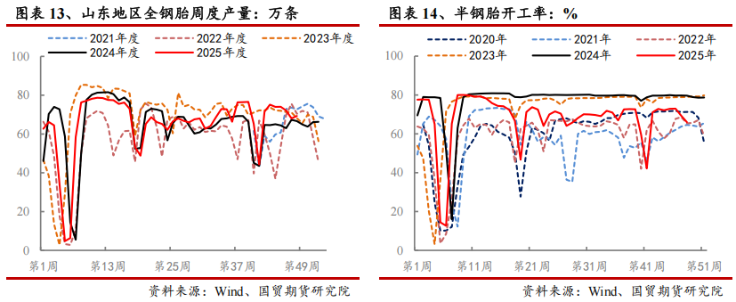 需求端,干胶方面,2025年全钢胎需求表现尚可,而半钢胎市场相对低迷。全钢胎方面由于今年道路运输货物周转需求依旧强劲,重卡替换用胎需求上升。根据中汽协数据,2025年1-11月份中国汽车产量2766.09万辆,同比增长13.09%。但由于新增汽车用胎数量有限,叠加2023-2024年半钢胎企业维持高负荷开工,半钢胎库存水平较高,在1050万条以上。因此今年轮胎需求主要聚焦于全钢胎市场,整体需求虽不及前两年,但较历史同期而言仍具韧性。此外,今年传送带月度产量下滑较为明显,替换需求有所下降,叠加海外橡胶年内中旬进口量维持高位,因此综合表现在库存水平上呈现出一定压力。 在浓乳终端市场,2025年乳胶手套全年开工率在六至七成,高端乳胶贴合制品需求有所下降。橡胶鞋底等发泡制品方面需求缩量较为明显,而低端充气产品订单需求表现相对稳定。