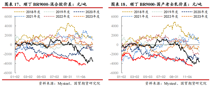 价差方面,RU价格受前期收储导致仓单减量以及近期东南亚洪水影响价格上行,但NR盘面价格仍相对低估,盘面NR-RU价差处于历史中位水平。从月差结构来看,RU合约长期处于远月升水格局,然而近期由于仓单下降较为明显,叠加集中注销因素,RU月间价差收窄。而在跨品种价差方面,由于近几年来国内丁二烯产能的大量投放,合成橡胶价格相对低迷,合成-天胶品种间价差扩大至历史极值。