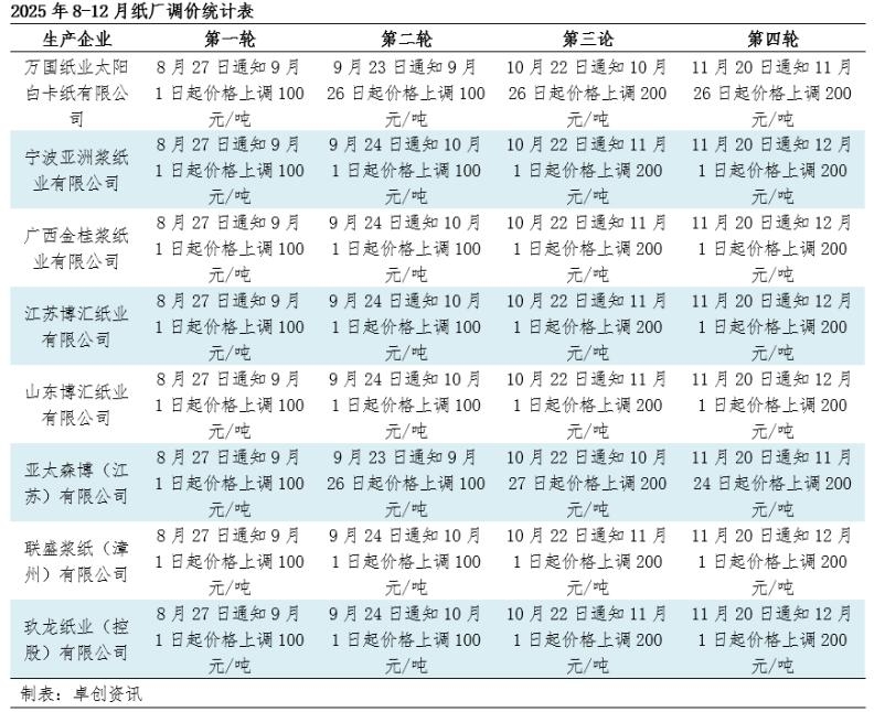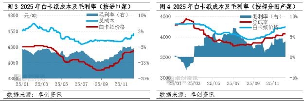 | 【导语】自8月底以来,白卡纸企业价格持续拉涨,在贸易商陆续跟涨带动下,市场价格逐步上行。原料成本则呈现先降后震荡增加趋势,与纸价走势存在阶段性背离。由于白卡纸价格整体涨幅大于成本,8月底以来行业盈利呈现改善趋势,依进口木浆为原料进行测算白卡纸仍处于亏损状态,但考虑国产浆替代性问题,规模企业整体处于微利状态。 白卡纸企业价格逐月拉涨,市场陆续跟涨 在“金九银十”背景下,白卡纸企业逐步进行价格拉涨。自8月底白卡纸企业通知9月价格提涨100元/吨开始,10-12月纸厂价格逐月提涨,从涨价函来看累计进行4轮、600元/吨价格上调,前三轮纸厂价格均已落实,第四轮涨价有待落实。由于纸价低位,以及长期价格倒挂,贸易商拿货热度陆续释放,出货价格亦逐步上调。卓创资讯数据显示,截至12月11日,国内白卡纸市场均价4244元/吨,较8月底价格上涨7.99%;常规品牌落实400-550元/吨涨幅,少数中高端品牌价格偏稳。从纸厂价格拉涨因素来看,除受市场刚需支撑外,低纸价以及高成本压力,亦是重要因素。
