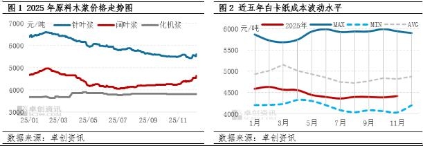 原料浆价走势分化,成本先小幅下滑后震荡增加 8月底以来,原料木浆不同浆种走势分化。其中阔叶浆在外盘价格上调、国内浆厂价格拉涨及国外浆厂检修等因素支撑下以震荡上涨为主。针叶浆受自身供需、金融属性、浆厂检修等消息面多重因素影响下先跌后涨;化机浆则整体波动不大。受原料价格波动影响,白卡纸成本整体呈现先窄幅下滑后震荡增加波动。截至12月11日,白卡纸成本较8月底上涨2.51%,整体涨幅窄于白卡纸价格上涨幅度。从近2025年白卡纸成本水平来看,9-11月成本整体处于近五年平均值以下。