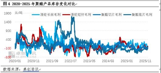 聚酯库存先降后升 聚酯产品利润修复但多数仍深陷亏损 四季度,聚酯终端市场需求季节性转弱,行业库存先降后升。10月下旬,地缘风险加剧推动国际原油价格反弹,叠加主要原料PTA市场“反内卷”预期升温,其价格止跌回升,成本支撑改善。叠加天气转冷,秋冬服装、家纺进入销售旺季,带动织造市场坯布面料需求持续改善。下游阶段性备货推动涤纶长丝等产品库存短期去化;但进入11月下旬,旺季效应弱化,坯布订单以小批量翻单为主,且10-11月,纺织服装出口金额分别同比下降8.84%、5.18%,内外需持续疲软。同时聚酯新产能集中释放,行业开工率维持89%以上高位,供应增量叠加终端刚需采购模式,导致11-12月涤纶长丝等产品库存逐步累积,预计年末涤纶长丝综合库存在23天附近,涤纶短纤库存在12天附近,聚酯切片库存在13天附近,聚酯瓶片库存在18.5天附近,分别较去年同期增加5.2天、1.3天、4.8天、2.5天。