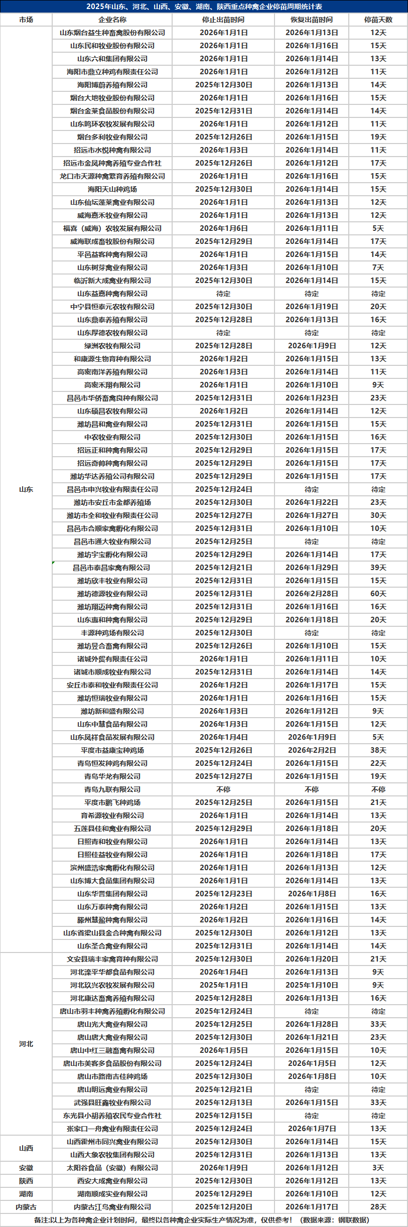 | 报告品种:鸡蛋 原文链接:https://mp.weixin.qq.com/s/eQ90AQkeXI65rQJ7uYmBhw?scene=1&click_id=3 导语:2025年临近尾声,白羽肉鸡种禽企业一年一度的停苗期陆续启动,再度成为行业关注焦点。Mysteel农产品紧贴市场动态,对山东、河北、山西、安徽、湖南等主产区90余家种禽企业开展专项调研,发现今年停苗安排呈现明显分化:部分企业提前进入停苗期,部分则选择延长停孵时间,还有不少企业至今尚未确定具体停苗周期。究竟是哪些因素导致停苗节奏如此不一?各企业的停苗期又是如何制定的?下文将结合Mysteel最新调研数据为您深入解析。 一、2025年90余家企业停苗周期明细表